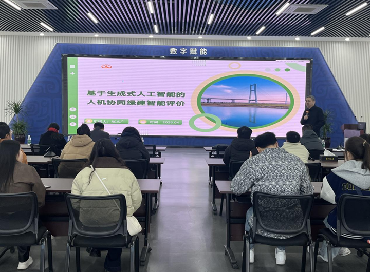 参观结束后,我院徐珂教授以“践行绿色建造,铸就品质工程”对工程建设项目绿色建造水平评价标准进行了详细解读,提出低碳发展理念将由宏观“碳核算”向精准“碳计量”转变;校外导师赵文广基于生成式人工智能的人机协同绿建智能评价展开讲述,强调了人机协同在提高评价效率和准确性方面的重要性;项目技术负责人叶童利用AI系统对工程建设项目绿色建造水平评价进行示范模拟,提升绿色建造项目的管理和评价水平。