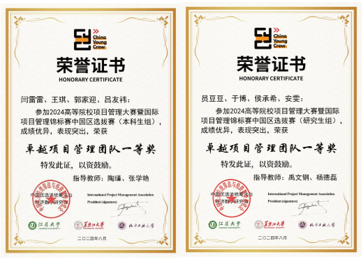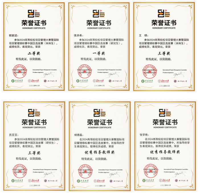 通过激烈角逐,WilliamHill6名学子在杨德磊、张学艳老师的带领下,获得了研究生组团队一等奖1项;本科生组团队一等奖1项;个人一等奖1项,个人二等奖2项,个人三等奖3项的优异成绩。其中,两名同学的个人赛成绩达到了获得国际项目经理资质认证D级证书资格。指导教师杨德磊、张学艳获“优秀指导教师奖”荣誉称号。