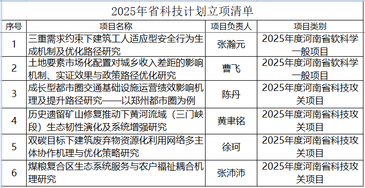 近日,河南省科技厅官网发布《关于下达河南省二〇二五年科技发展计划的通知》,我院6位教师申报的课题获批立项,其中软科学项目2项,科技攻关项目4项。本次科技发展计划项目申报,学院精心组织、积极动员,取得了可喜成绩。